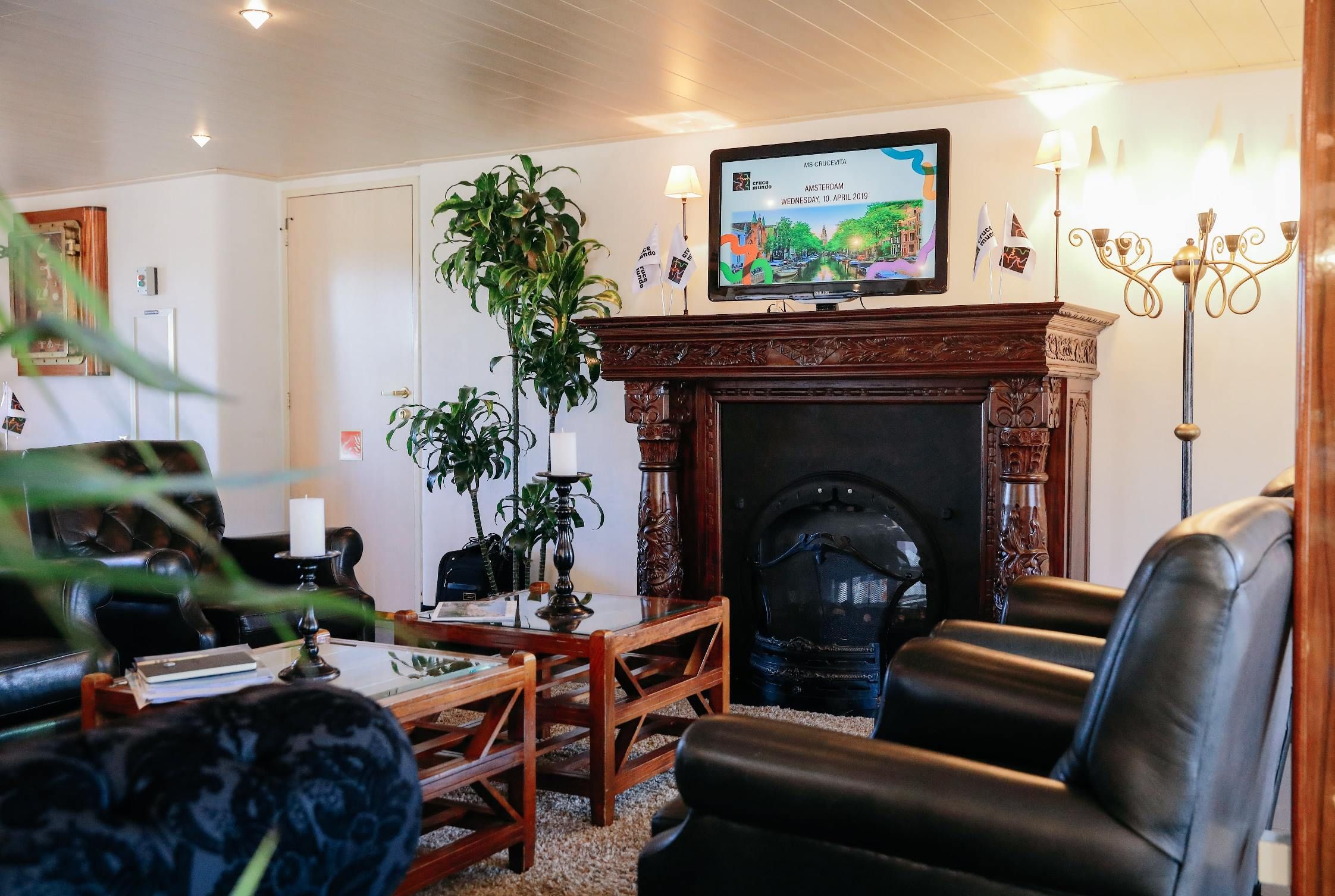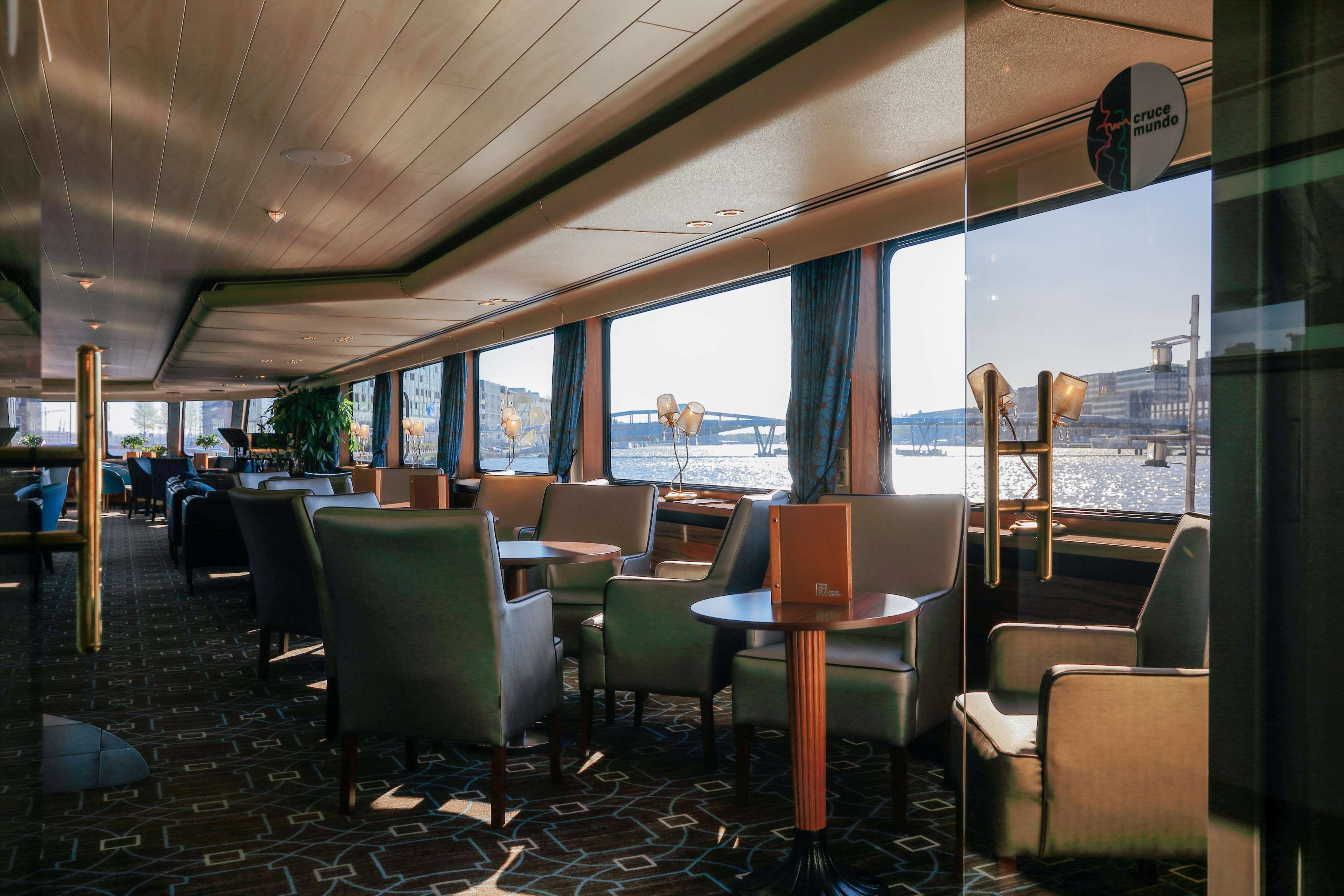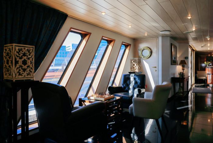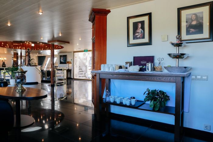 На разположение на гостите са ресторант, бар, зона с камина и кресла, машина за кафе и чай на самообслужване през целия ден, библиотека, сауна и фитнес, слънчева тераса със шезлонги, безжичен интернет срещу заплащане. Корабът разполага с 3 палуби, капацитетът е 110 гости.