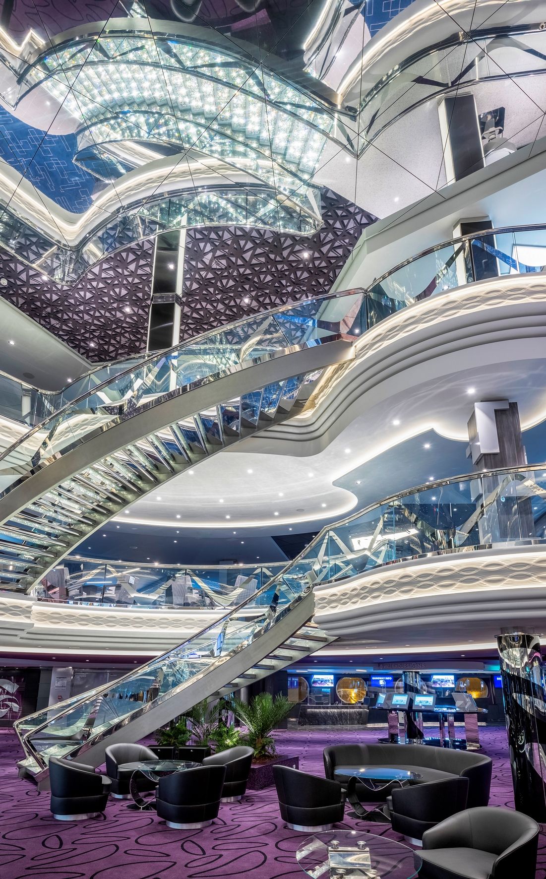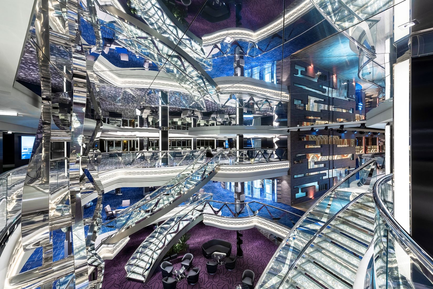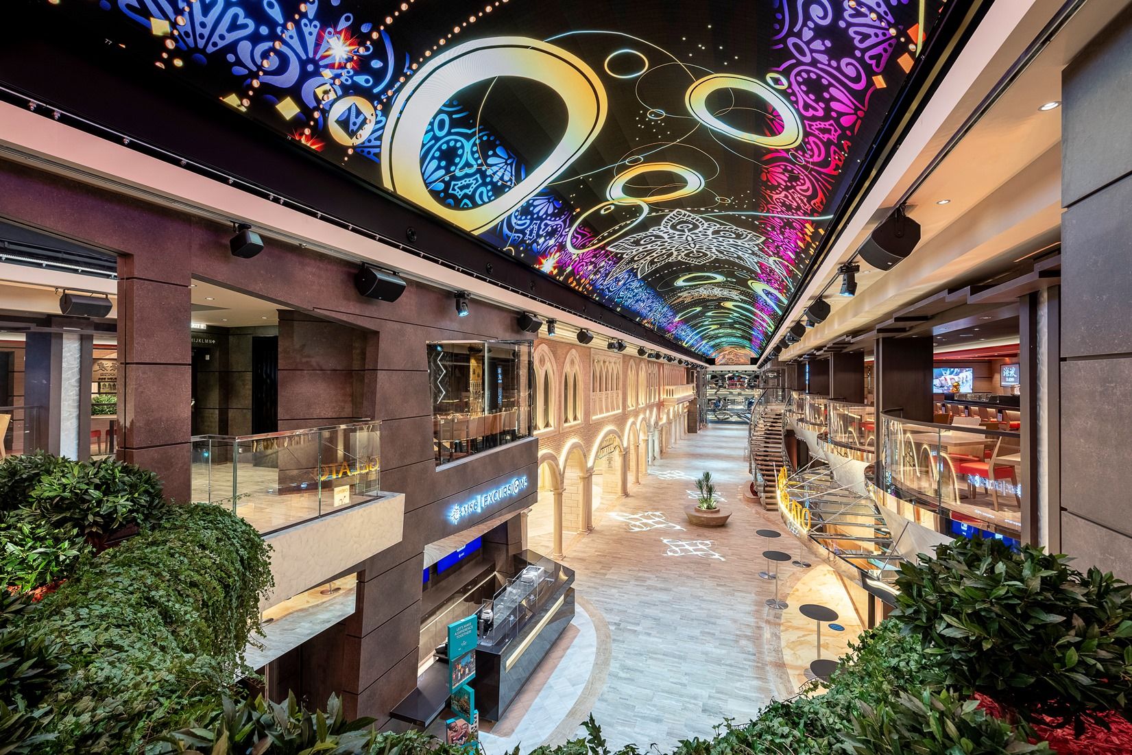 Класическата вече за корабите от флотилията вътрешна променада с LED таван, обградена от ресторанти и магазини, отново се превръща в център на социалния живот на борда, както и в сцена на различни партита и събития.