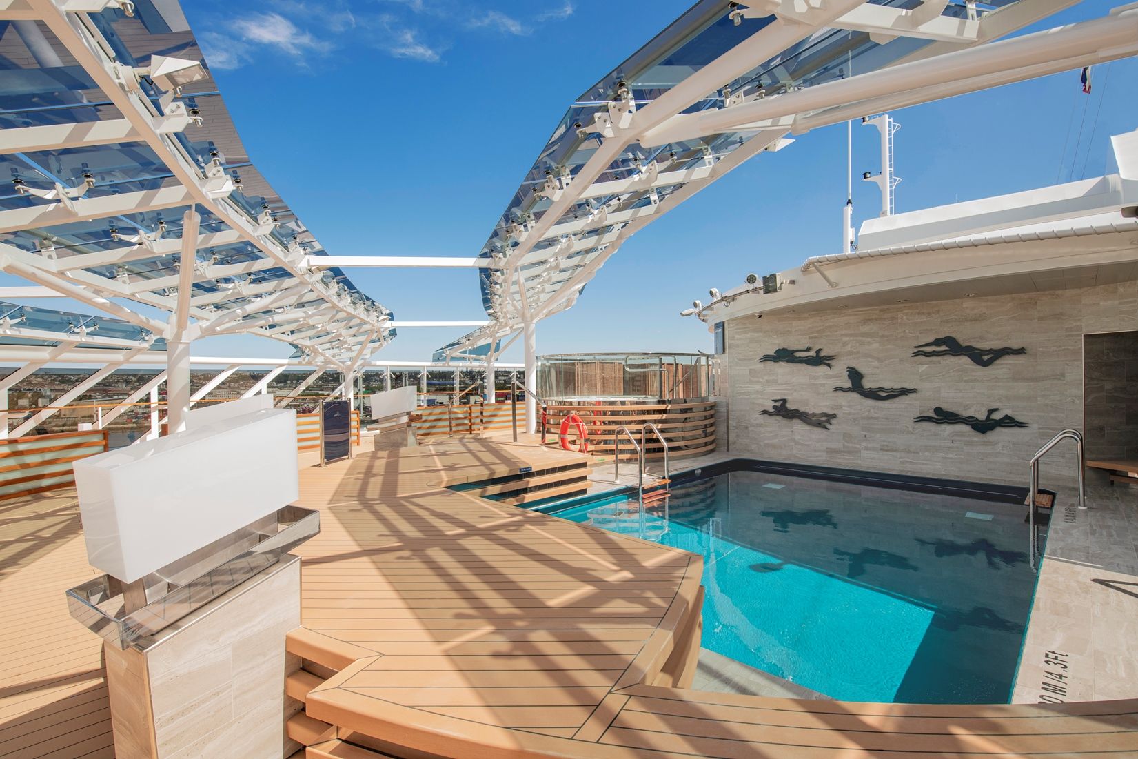 5 басейна и аква парк с водни пързалки и голяма плажна зона с шезлонги около тях на откритите палуби, СПА център с масажи и козметични процедури, фитнес с уреди от Technogym, солариум, спортна зона с игрище за баскетбол, волейбол, фитнес и тенис, симулатор на Формула 1.