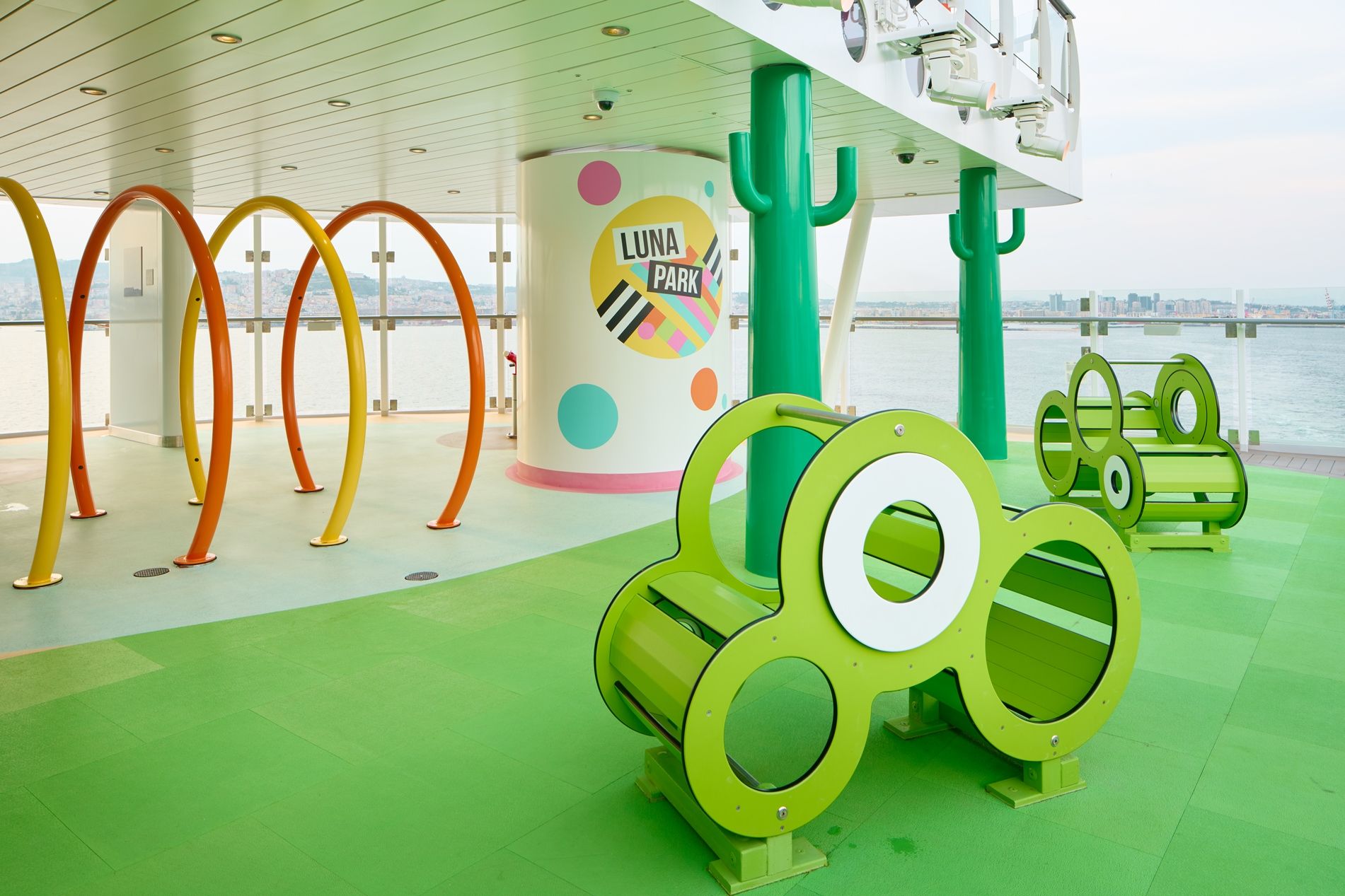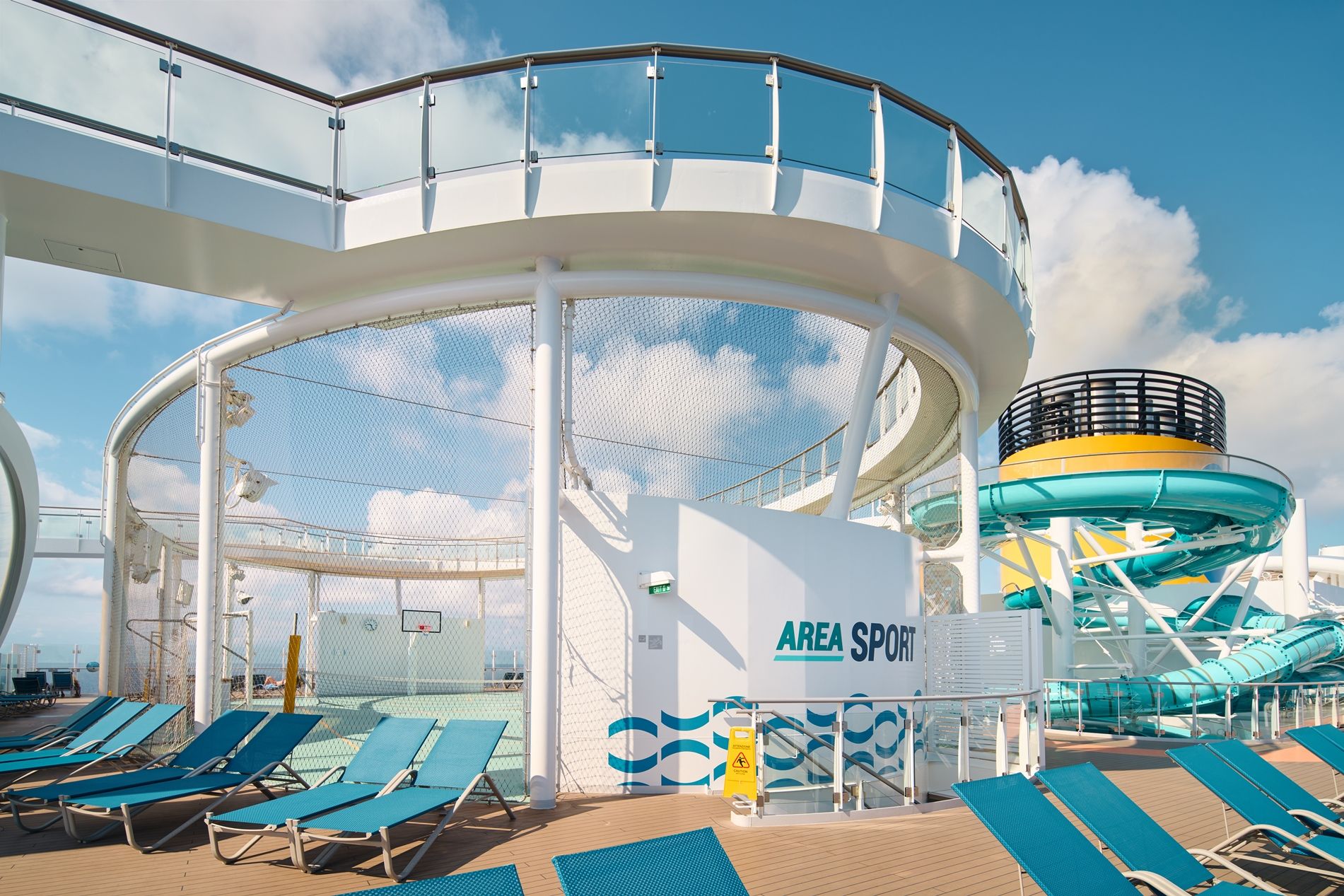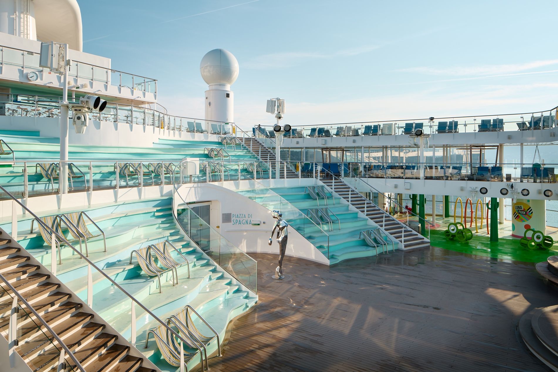 Отпуснете се на шезлонгите около басейните на откритата палуба или посетете пързалките на аквапарка.