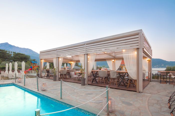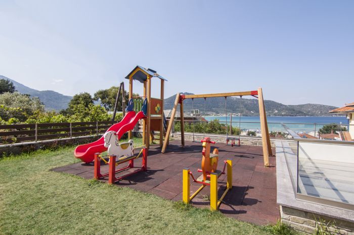 Комплексът разполага с два външни басейна и открито джакузи. Основният басейн е оборудван с вграден хидромасажен сектор, а вторият е двуетажен басейн с плитка зона за деца, което го прави подходящ за семейства с деца и спокойна лятна ваканция в Тасос.