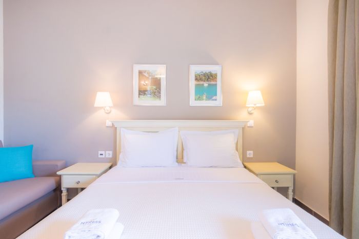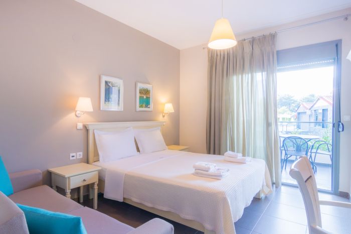 Хотелът предлага модерно обзаведени студиа и апартаменти, оборудвани с всички удобства за комфортен престой. Гостите могат да се възползват от безплатен Wi-Fi, както и от красива гледка към Егейско море или към градината.