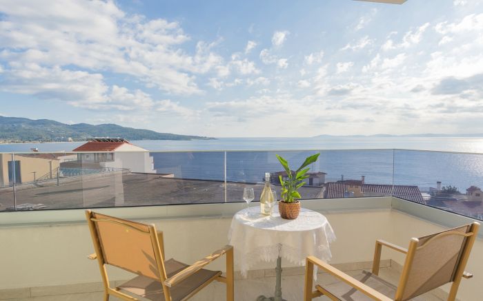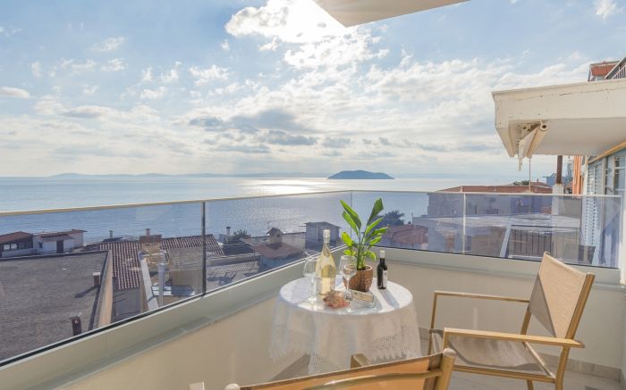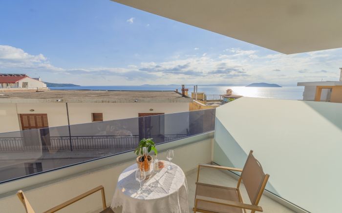 Всеки апартамент има самостоятелен балкон с морска гледка, обзаведен с маса и столове, идеален за релакс по всяко време на деня.
