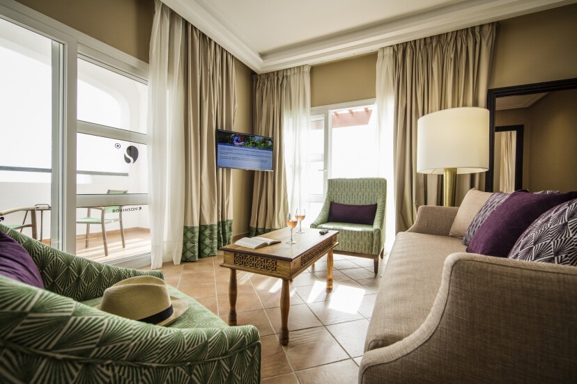 В стаите: Всички стаи са с балкон или тераса, с градински маса и столове и/или шезлонги, сателитна телевизия, сейф, сешоар, минибар. Двойни стаи-33 кв.м, две двойни легла или спалня, диван в лаундж зоната. Фамилни стаи- 66 кв.м., 2 отделни спални свързани помежду си, с две двойни легла, фамилна спалня и две бани. Senior Suite и Junior Suite- 105 кв.м., хол, 2 отделни спални, 2 бани с душ кабина и вана и гледка към морето.