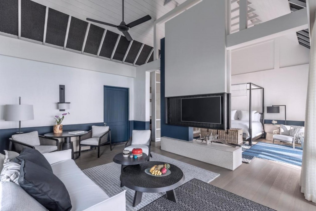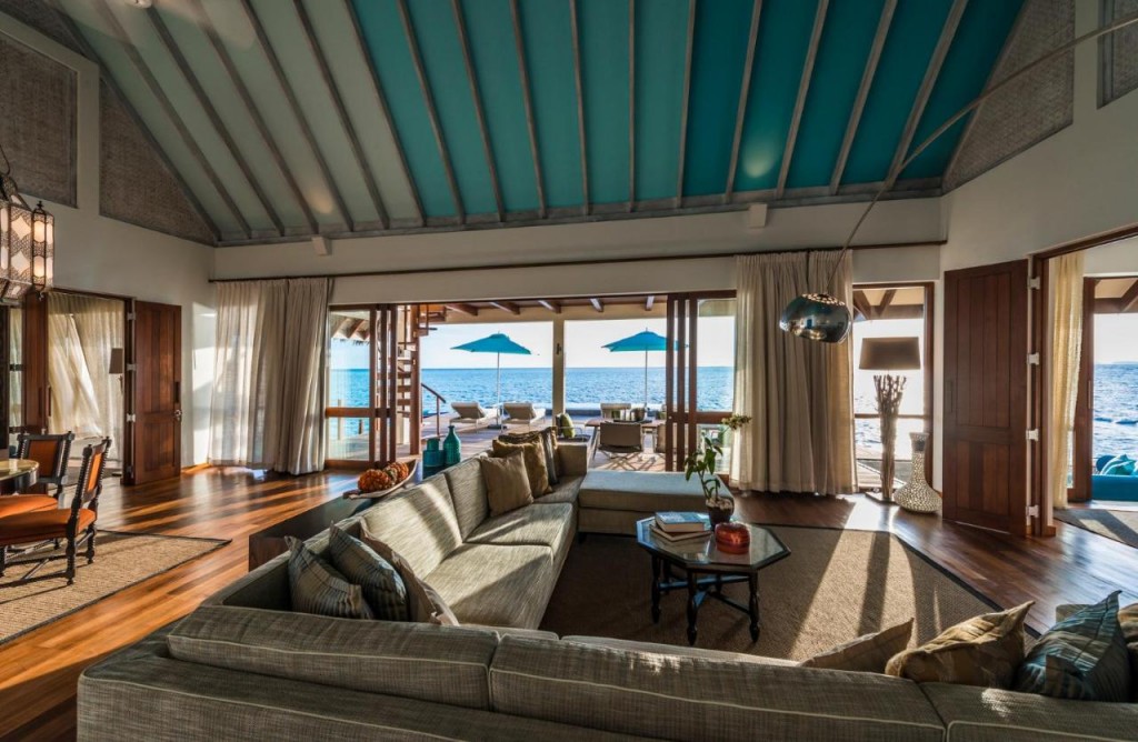 Триспален суит над водата (294 м² + 397 м² външно пространство) с две легла king и две единични легла, за до 6 гости, включително до 5 деца.