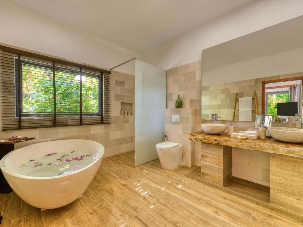 В стаите: Стаята разполага със собствен басейн, минибар и хладилник за вино, телефон, плажна чанта и чехли, станция за кафе и чай, вана и душ, климатик, вентилатор, телевизор, сейф и безплатен Wi-Fi.