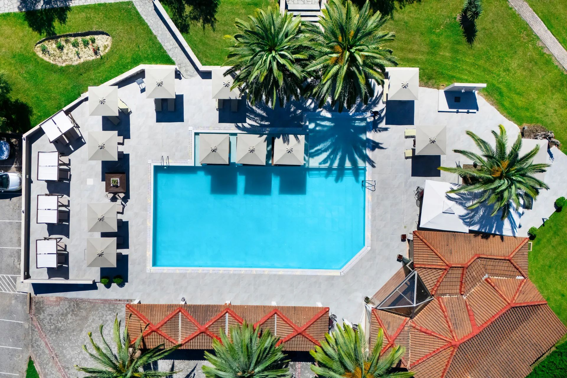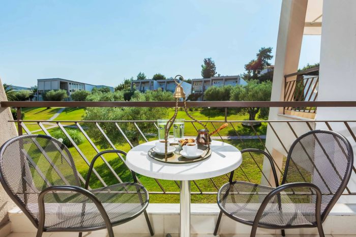 Хотелът разполага с 93 стаи, разположени амфитеатрално с гледка към басейните и обширните градини. Те са оформени с тревни площи и маслинови дървета, разнообразни сезонни растения и впечатляващи палми, които създават усещане за истинска гръцка ваканция.
