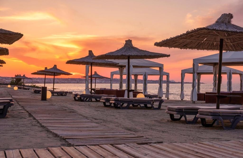 Плаж: Частен пясъчен плаж на 50 м от хотела (1 брегова линия). Чадърите и шезлонгите са безплатни, беседка на плажа - безплатно за определени видове апартаменти и вили.
