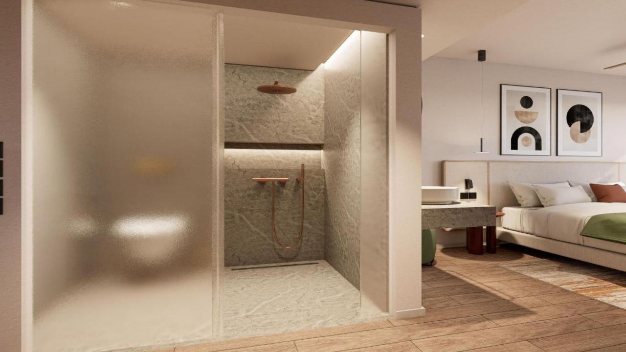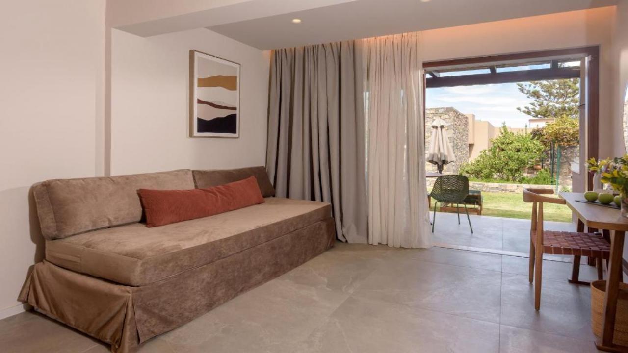 Стаите и суитите са оборудвани с климатик, сателитна телевизия и хладилник. Някои стаи са с директен достъп до общ басейн. Мезонетите включват собствен басейн с хирдомасжна вана.Всички помещения за настаняване имат балкон или тераса с изглед към Критско море или градините на хотела.