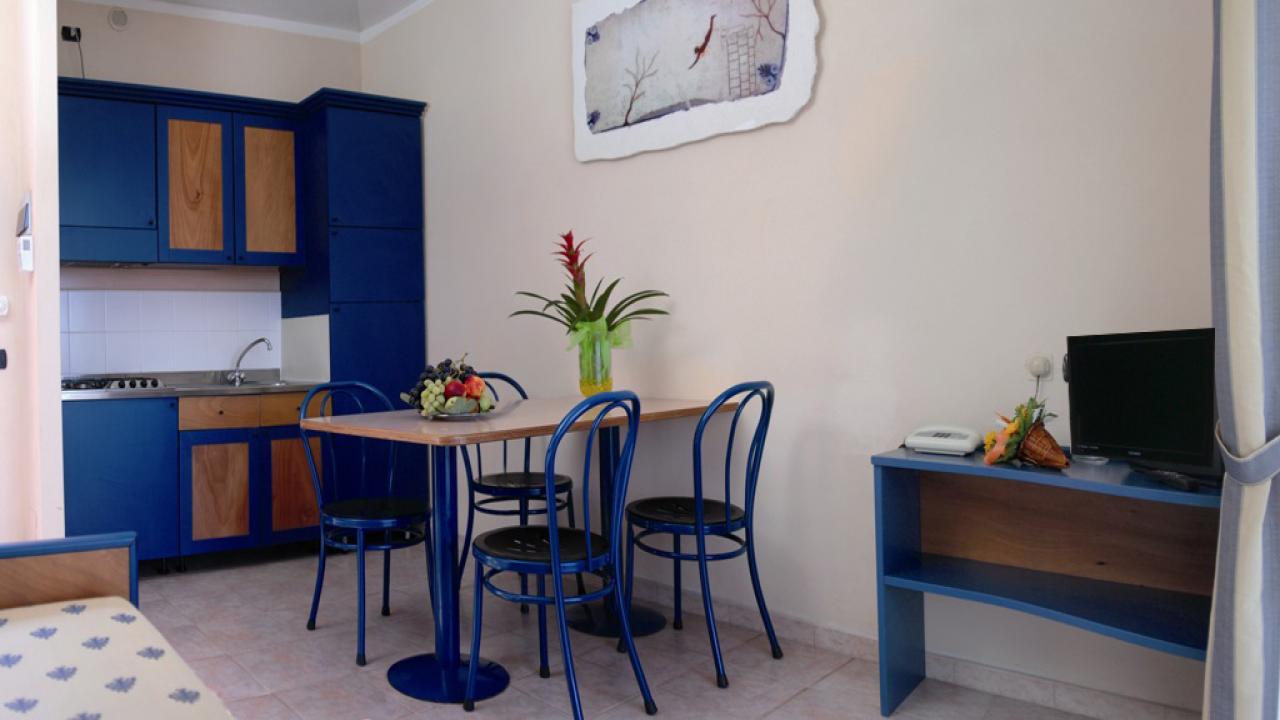 Akiris Resort 4* предлага настаняване в широки стаи, които разполагат с тераси и гледка към градината или басейна. Стаите са разположени на първи или втори етаж и са лесно достъпни за трудно подвижни хора. Апартаментите разполагат и с хладилници.