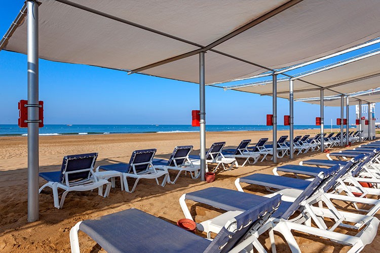 Плаж: Собствен пясъчен плаж на 350 м от хотела, от другата страна на пътя. Шатъл до плажа, безплатно. Шезлонги, чадъри, плажни кърпи - безплатно. Вход в морето - пясък. Душове, кабини за преобличане, спасител, бар на плажа.