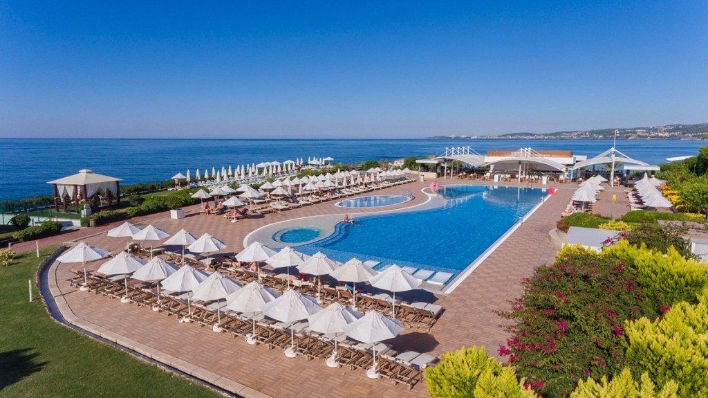 Основен ресторант, 3 а ла карт ресторанта, 5 бара, закрит и открити басейни, 3 водни пързалки, мини клуб, батут, турска и парна баня, сауна фитнес, диско бар, билярд, дартс, тенис на маса, безжичен интернет. ПЛАЖ: Собствен, платформа и пясъчно - чакълест. Чадъри, шезлонги и матраци на плажа и при басейна – безплатно, плажни кърпи – безплатно.