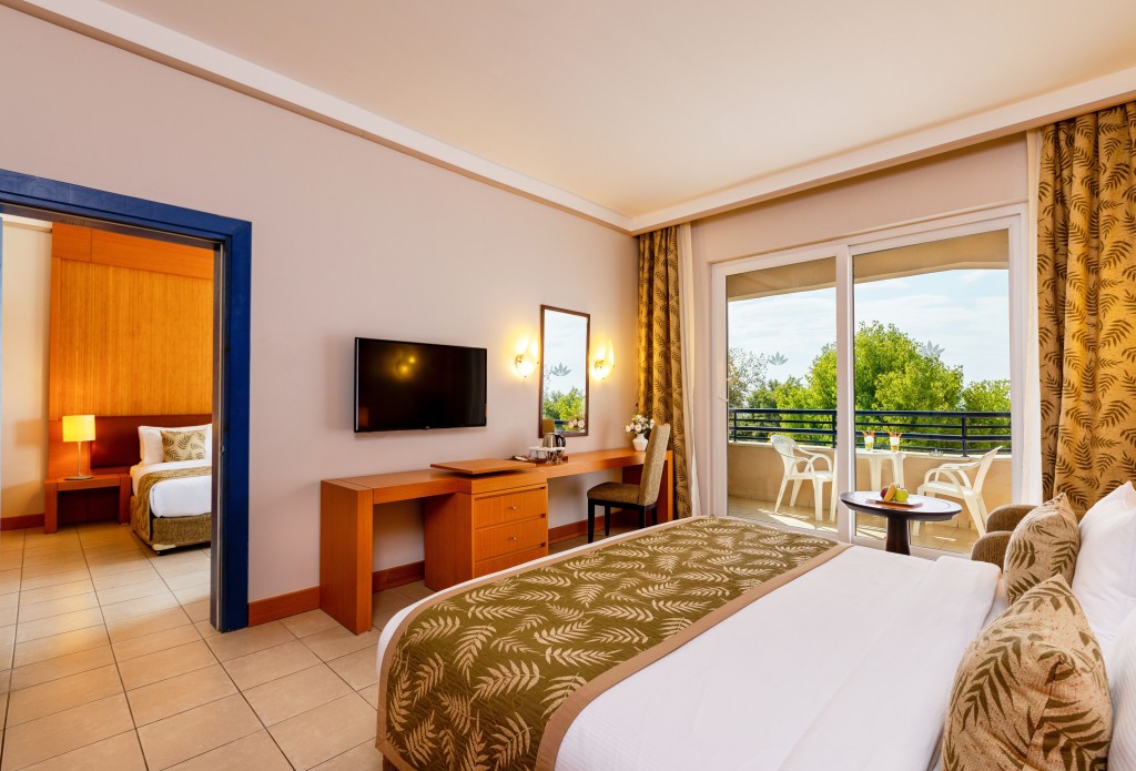 Suite Sea View - 56 m², Разположени в в анекс сградата – бунгало, тези апартаменти включват една спалня и една всекидневна зона със свързваща врата и разполагат с двойно легло, сгъваеми допълнителни легла, балкон или тераса. Всеки апартамент разполага с централен климатик и керамичен под. Всяка стая разполага и с LED телевизор с местни и международни канали, телефон с директно избиране, сейф, сет за приготвяне на кафе и чай и минибар (само водата е безплатна), огледало за грим, тоалетни принадлежности, чехли, халат, сешоар, банята е с вана, ежедневно почистване на стаите.
