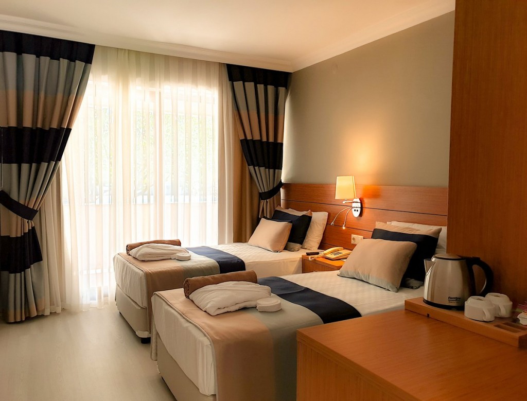 В стаите: Хотелът се състои от 260 стаи. Всички стаи са оборудвани с: климатик, телевизор, телефон, сейф, мини бар, баня с вана, сешоар, балкон, WiFi ( заплаща се допълнително ). Почистване на стаите - всеки ден, смяна на бельото - 3 пъти седмично.