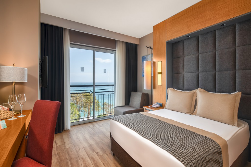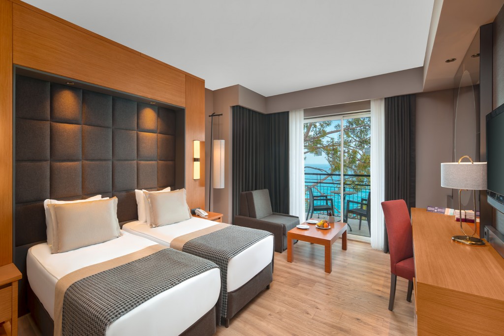 Стая с частичен изглед към морето в главната сграда (26-31 м2 ширина, Разполага с едно двойно легло или две единични легла)