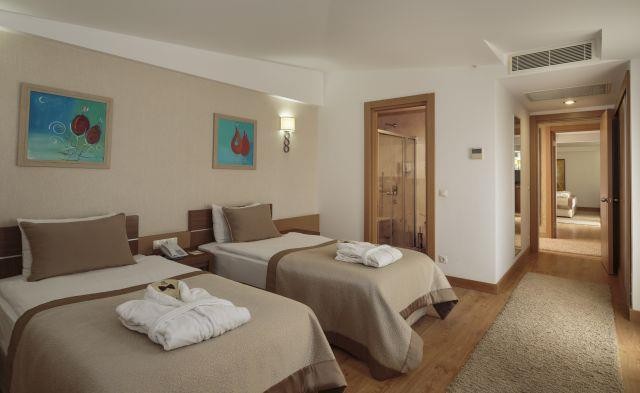 В стаите: Хотелът се състои от три 5 етажна сгради и къщички на езерото, оборудвани с асансьори и разполага с общо 673 стаи. Всички стаи са оборудвани с климатик, телевизор, телефон, баня с душ/вана, сешоар, мини бар (безплатен), сет за кафе/чай, сейф (безплатен). Почистване на стаите - всеки ден, смяна на кърпите – при заявка, смяна на спалното бельо – 3 пъти седмично.