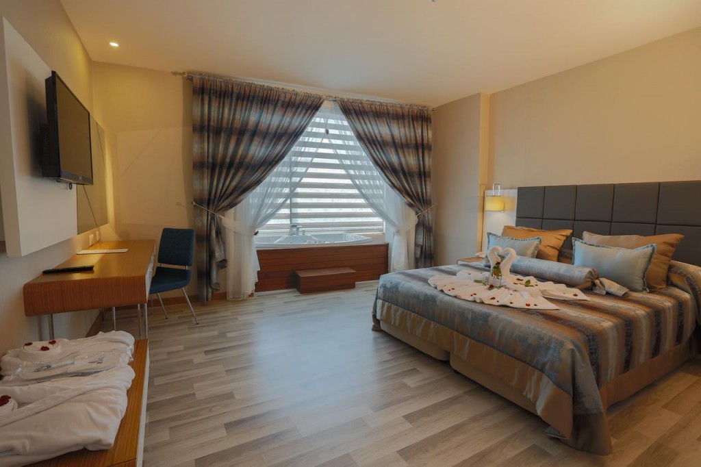- Делукс апартамент: (57 м²) Една спалня, хол с мека мебел, джакузи, тоалетна и душ, сешоар, сателитна телевизия, LCD телевизор, телефон, сейф, минибар, сплит климатик, ламинат и просторен балкон.