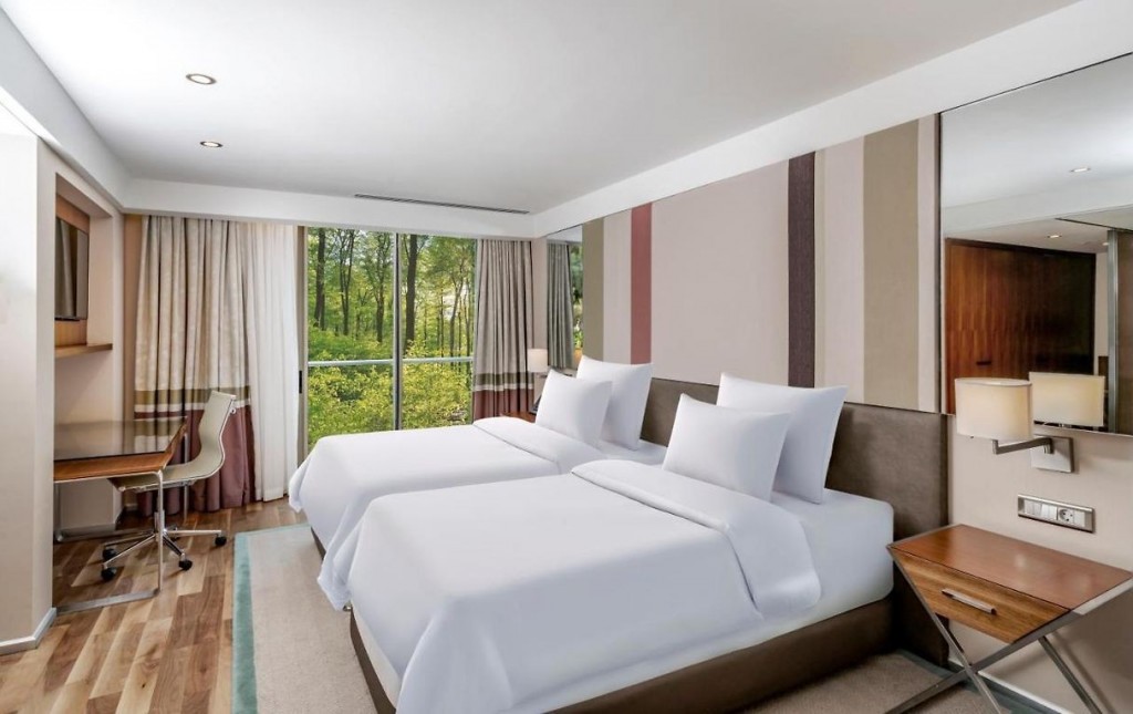 В стаите: Хотелът се състои от основна 5-етажна сграда с общо 401 стаи. Оборудвани са с индивидуално контролиран климатик, мини-бар, електрическа кана (чай и кафе асортимент, безплатно), телевизор (със система за двоен екран), музикален канал, игрална конзола (PlayStation 4, безплатно; задължително се оставя възвращаем депозит), проектор, директна телефонна линия в стаята и в банята, интернет (безплатно), баня, тоалетка и сешоар, сейф, балкон (не във всички стаи), под - килим. Почистване на стаите - ежедневно, смяна на спално бельо - 3 пъти седмично.