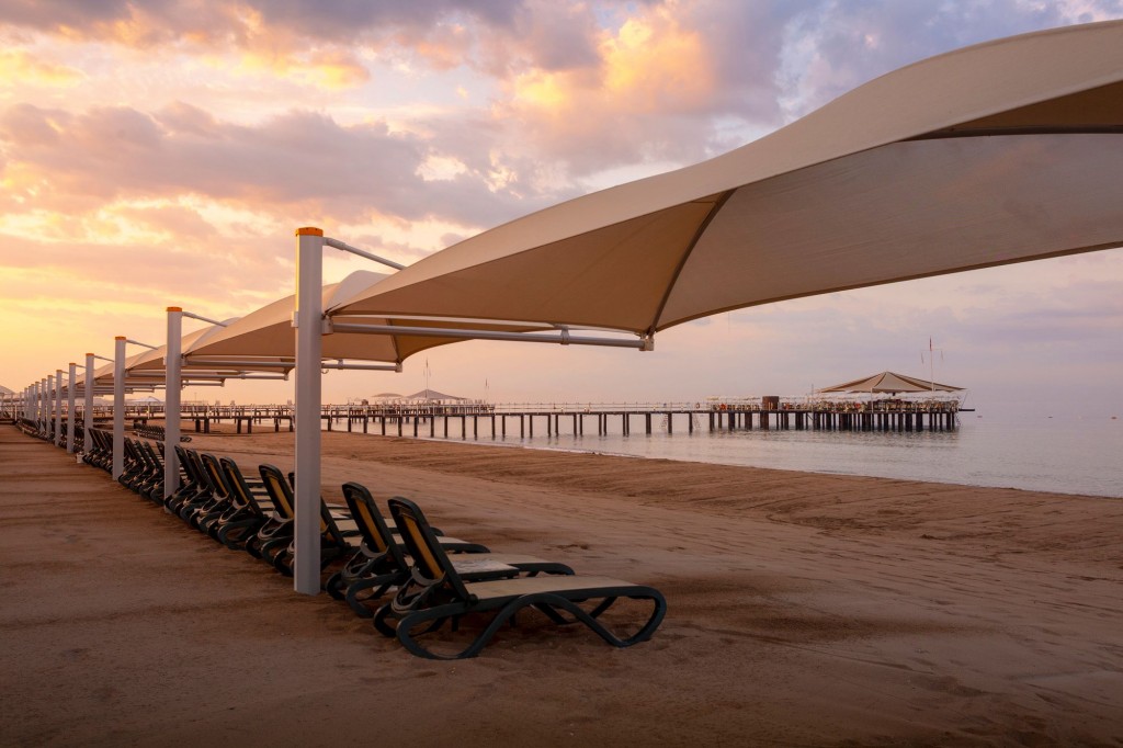 Плаж: Собствен, пясъчен с дължина 250 м. Чадъри, шезлонги и матраци на плажа и при басейна – безплатно, плажни кърпи – безплатно,Бар на плажа. Голям пирс. Плажни кърпи-безплатно. Шатри на плажа-платено.