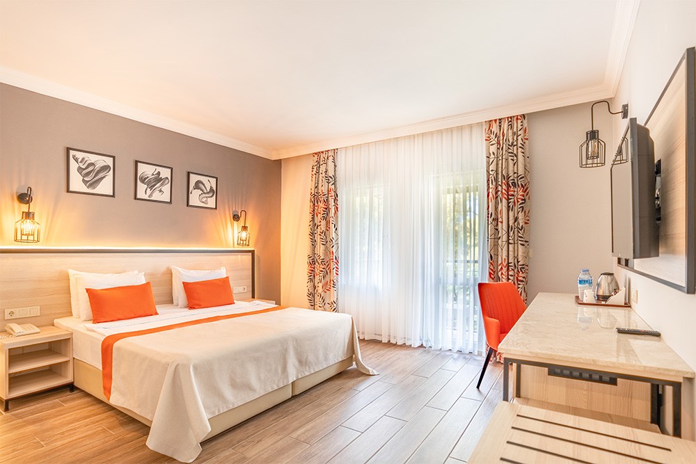 В стаите: Хотелът разполага с общо 530 стаи – състоящ се от една 2-етажна сграда, двуетажни и триетажни вили. Всички стаи са оборудвани с електронна ключова система, подова настилка - керамични плочки, балкон, климатик, цифров сейф, LED телевизор (40 инча / 101 см) със сателитна телевизия, баня с душ, WC, тоалетни принадлежности за баня и халат, сешоар, мини бар (Вода, безалкохолни напитки, минерална вода, плодов сок - кен, бира, плодово мляко), телефон, Wifi, сет за приготвяне на чай и кафе.