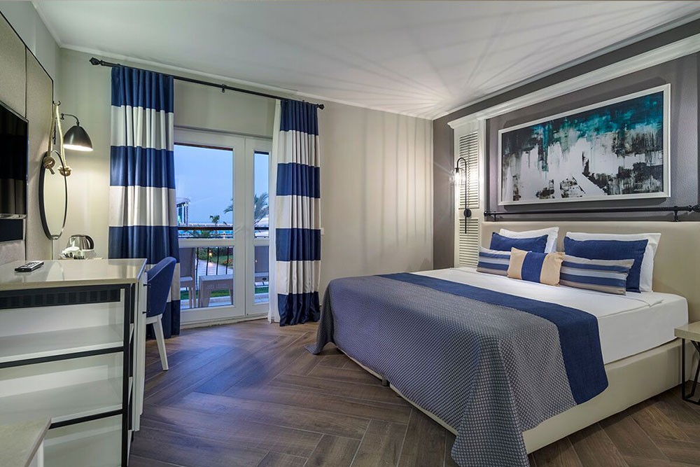DELUXE ROOM - Има 8 луксозни стаи, разположени в клубната част на комплекса. Модерно и стилно обзаведени стаи с прекрасна гледка към морето, които са с размери 34м2, разполагат с Kingsize легло, разтегателен диван и кът за сядане. * Гостите, настанени в тези стаи, могат да използват безплатно A’la Carte ресторанти по време на престоя си.