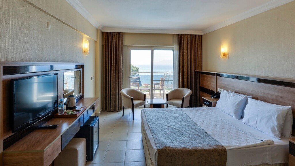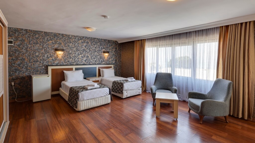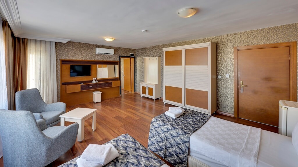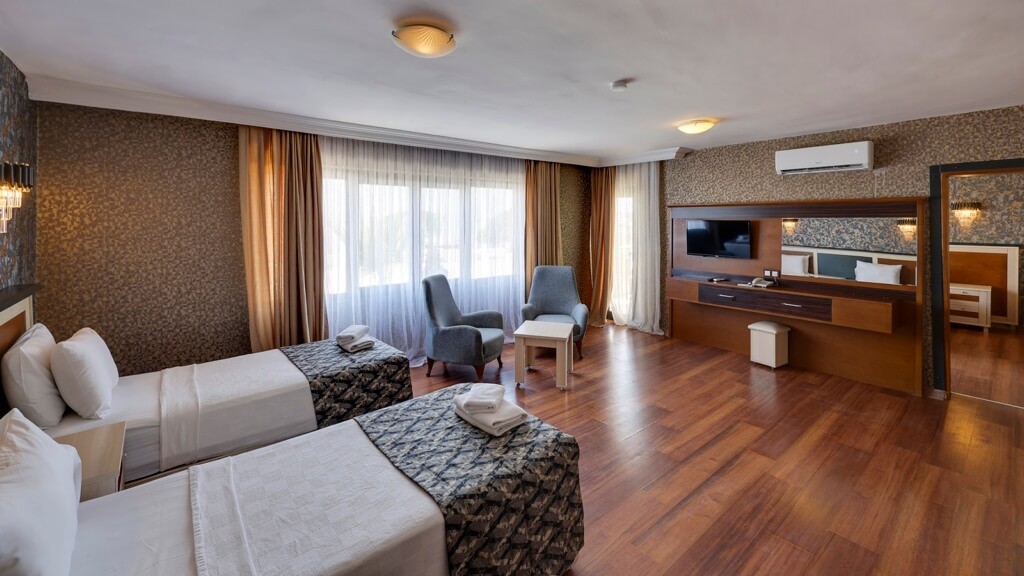 Хотелът разполага с 235 стаи, разположени в 4 блока: стандартни стаи Standard (27 м2), Superior (32 м2, с изглед море), Family (52 м2, дневна и спалня). Всички стаи са оборудвани с климатик, телевизор, телефон, баня с душ, сешоар, минибар (всекидневно зареждане на вода - безплатно), сейф (срещу заплащане), балкон, Wi-Fi интернет. Почистване на стаите - всеки ден, смяна на спалното бельо - 2 пъти в седмицата.