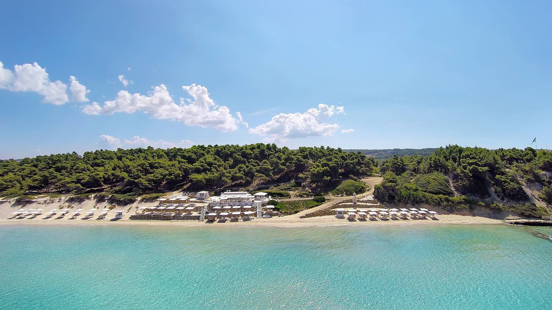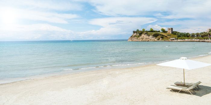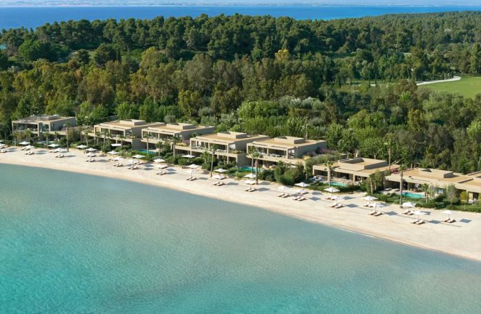 Разположен на самия морски бряг, хотелът предлага директен достъп до собствен частен плаж с фин златист пясък и кристално чисти води на Егейско море. Спокойната и елегантна атмосфера го прави идеален избор за романтична почивка или луксозно бягство от ежедневието.
