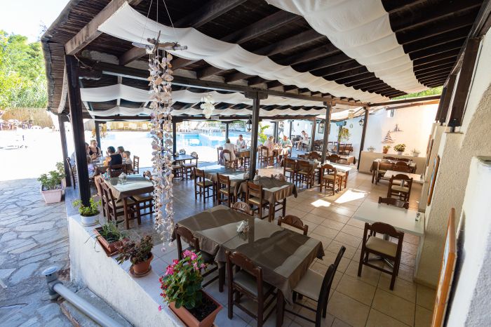 Ресторантът предлага както открита зона с гледка към басейна, така и просторна вътрешна зала. Денят започва с континентална закуска на бюфет, а вечерите са посветени на домашно приготвени гръцки ястия.