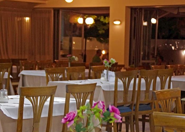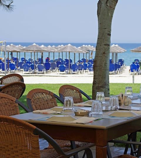 Ресторантът предлага разнообразие от гръцка и международна кухня, а pool барът – напитки, коктейли и леки закуски през деня. Осигурено е безплатно WiFi в общите части и 24-часово обслужване.