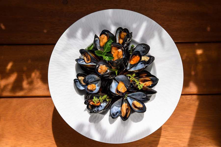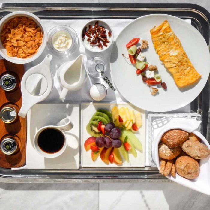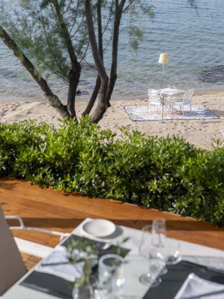 Гостите могат да се насладят на модерна гръцка и средиземноморска кухня в изискания ресторант на хотела, разположен с панорамна гледка към морето, както и на авторски коктейли в Champagne бара. Предлага се и възможност за индивидуално меню и обслужване във вилата.