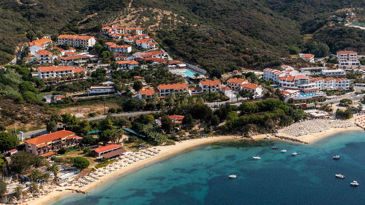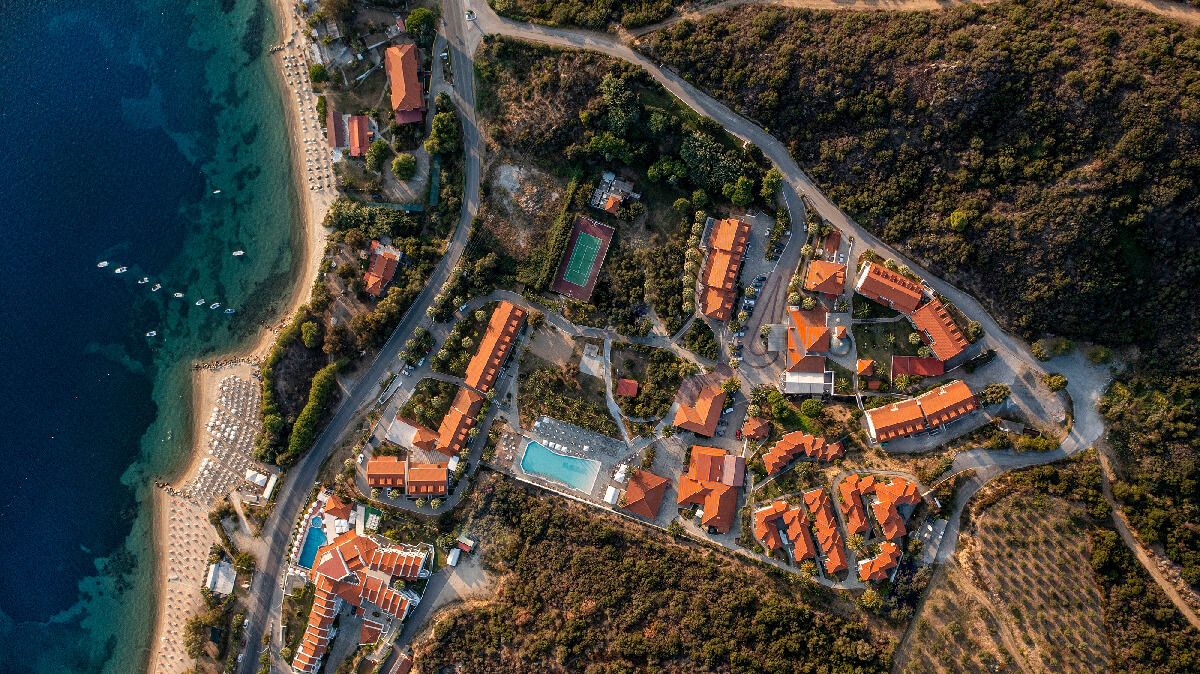 Хотелският комплекс „Aristoteles“ е изграден във формата на амфитеатър, само на 150 м от морето, в прекрасен и спокоен район близо до Урануполи и в непосредствена близост до Света гора, на третия ръкав на Халкидики.