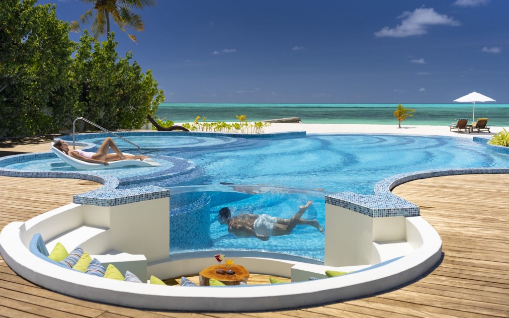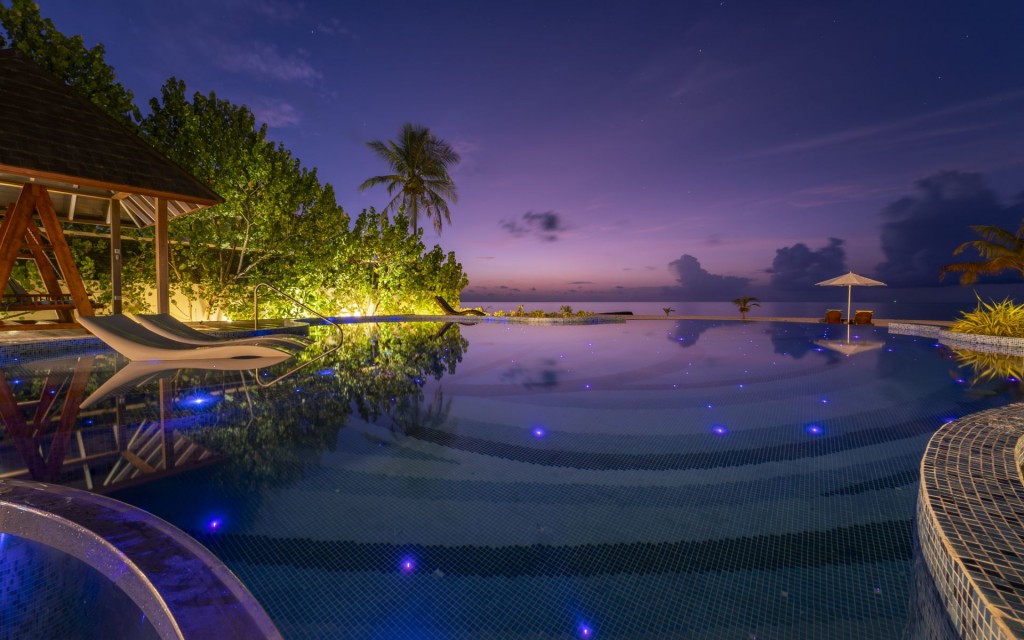 Потопете се в луксозно островно бягство в плажни вили с басейн. Насладете се на гледка към лазурната лагуна на остров Канифуши от леглото си. За 2 възрастни и 2 деца или 3 възрастни и 1 дете, с 1 легло Queen, площ 194 м², басейн 36 м².
