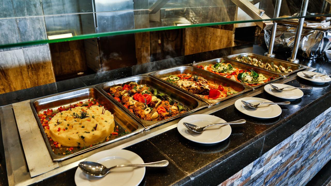 Предлага закуска, обяд и тематични вечерни бюфети с интернационална кухня.